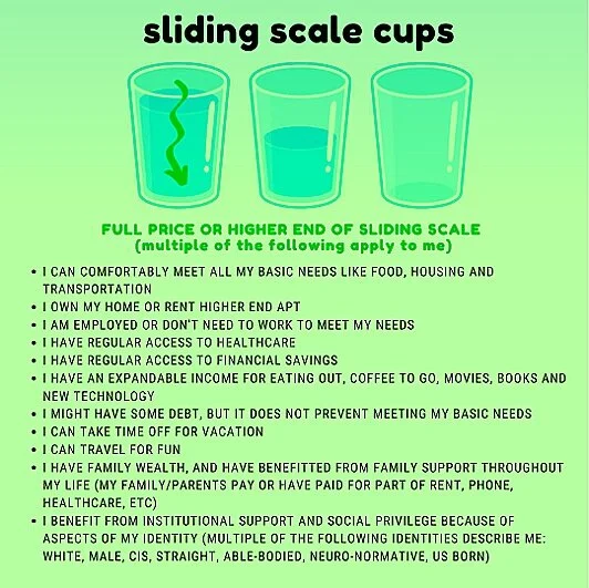 This sliding scale model has been adopted from Chicago based acupuncturist Chiara who is part of the Chicago Healing Justice Network, which aims to promote healing justice from an anti-oppression framework.